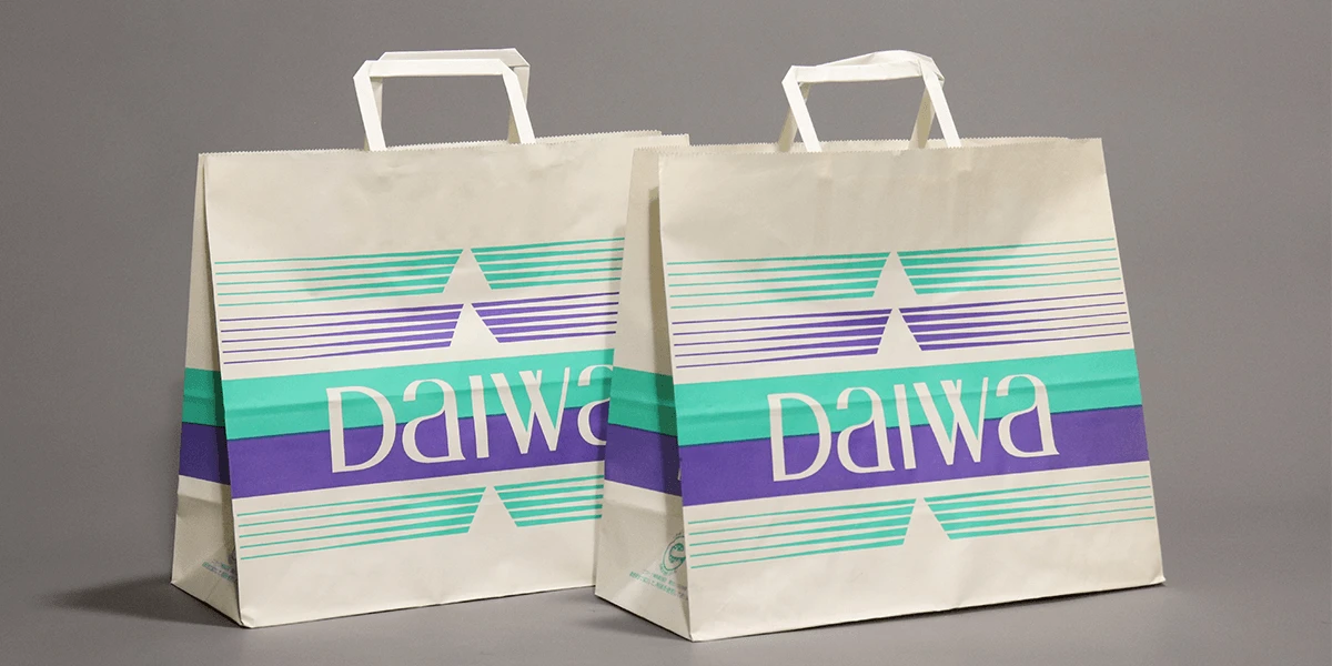 大和の紙袋は中央に大きくロゴタイプが配置され、コーポレートカラーの二つの色面で分けられているのが特徴。ロゴタイプの上部には3つ、下部には1つのボーダーパターンが構成されている。中央の白抜きにした▲がシンボルマークを展開しつつ、線幅が太くなっていく白のボーダーによって光を照らす様、和の広がりを表現している。特にロゴタイプは百貨店の紙袋として相当大きく配置されており、誘目性と印象の強いデザインにまとまっている。