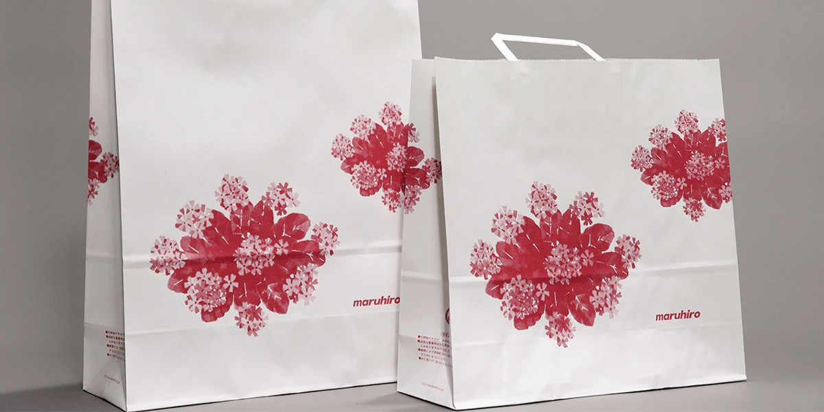 丸広百貨店は埼玉県内に5店舗を展開する地方百貨店。ひとつの都道府県に5店舗以上展開するのは丸広百貨店と京阪百貨店のみである。そんな丸広百貨店の紙袋には埼玉県の県花「サクラソウ」が単色で描かれている。地域に根差した百貨店としての姿勢が強く表現されている。右下にはmaruhiroのロゴタイプ。