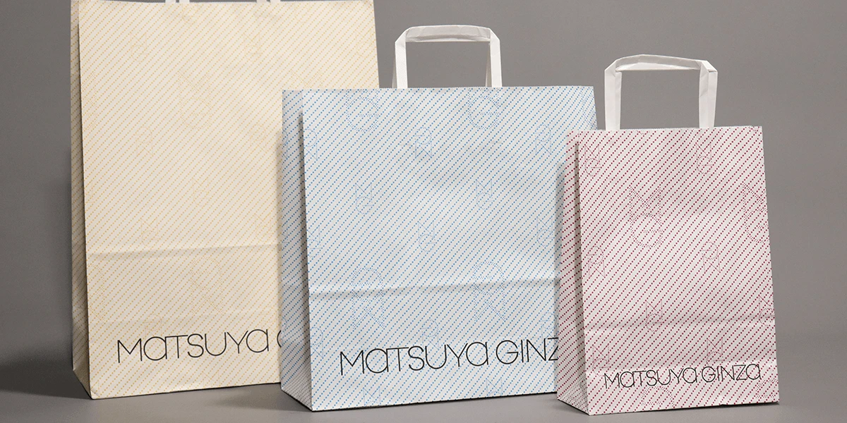サイズによって赤、青、黄、緑とカラーバリエーションが用意されており、特選用は白の清潔なイメージにまとまっている。銀座の地で長く営業し、デザイン分野への積極的な姿勢で知られる松屋らしい良質なデザインの紙袋だ。