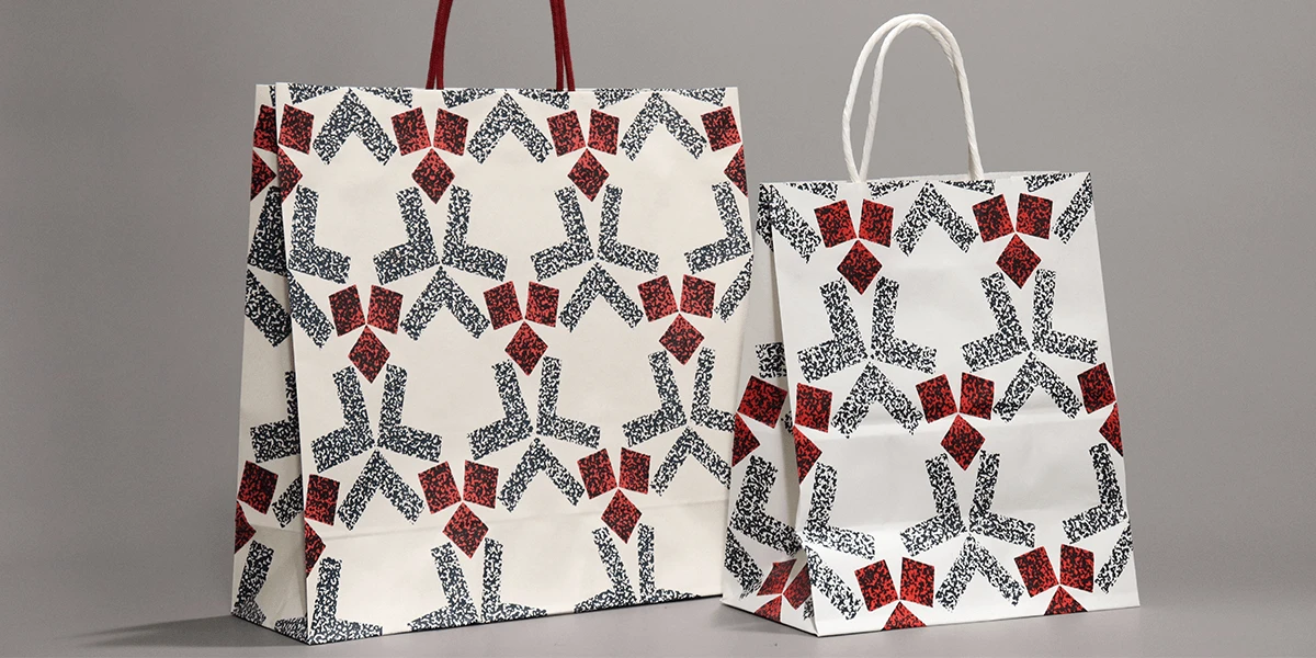 また、OFで作られることにより紙袋全体にデザインを展開することが可能になっている。これによりどの角度から見ても途切れのないパターンが展開されている。印刷されるグラフィックと立体物としてのプロダクト、双方の要素を併せ持つ紙袋らしい紙袋といえる。