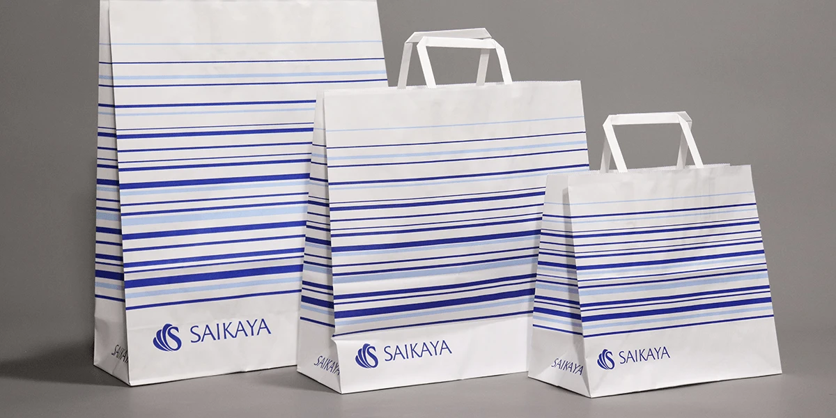 不規則なウェイトのボーダーは上部に行くほど細くなり、奥行きのあるデザイン。彩度の異なる2つの青による配色で単調ではない。左下に配置されたロゴタイプも相まって、構成としては安定している。海と空の明るさをうまく表現しながら百貨店の紙袋としての安定感を併せて持っている。
