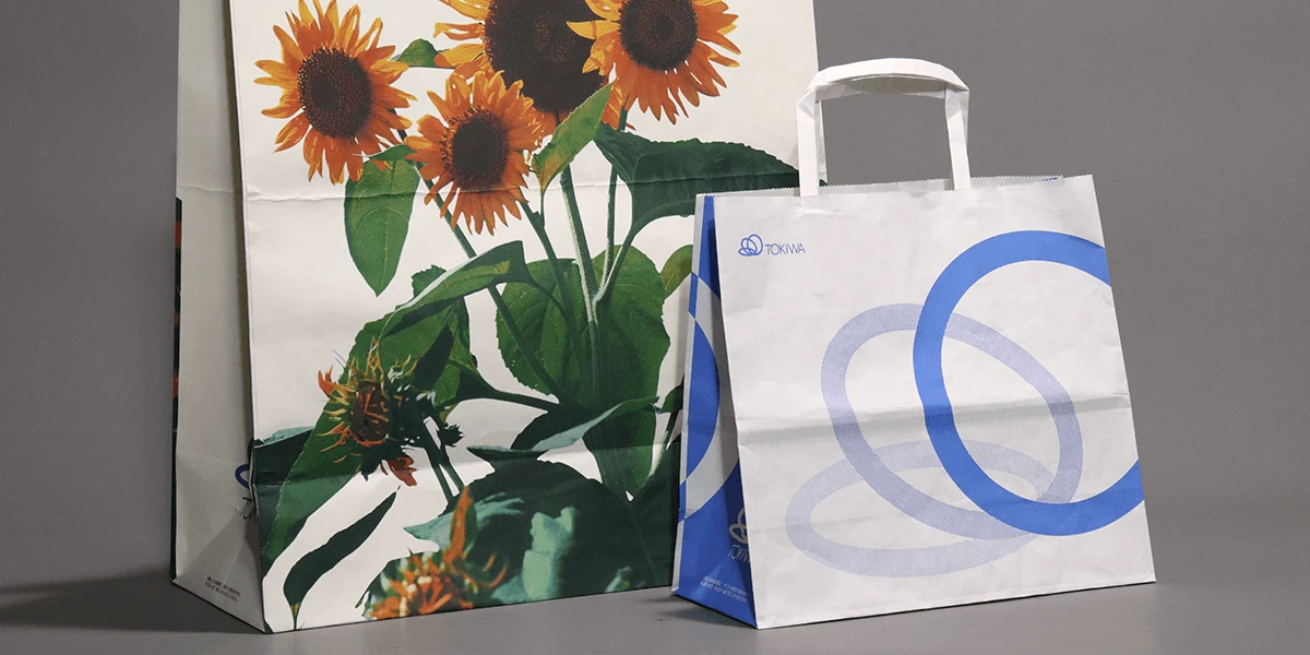 トキハの紙袋はCIの3つの輪からなるシンボルマークを展開したデザイン。この3つの輪は「お客さま」「大分」「トキハ」を表現するとともに、シンボルフラワーのひまわりが太陽を向いてゆく姿を表現している。デザイナーはCIデザインにおいて著名な原田進と同氏率いるプラクシス社、1985年にトキハが創業50周年を迎えるにあたり制作された。