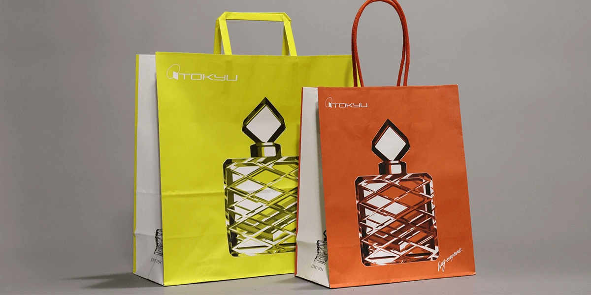 東急百貨店は見る通り香水瓶がデザインされている(明確に香水瓶と公称されているわけではない)。一般に百貨店の紙袋には花や動物などの有機物が採用されるが、東急百貨店は無機物である香水瓶をモチーフにしている。 また色彩も特徴的で、明度の高い黄緑やオレンジなど誘目性の高い配色になっている。これらのことから百貨店の紙袋としては挑戦的なデザインといえるだろう。